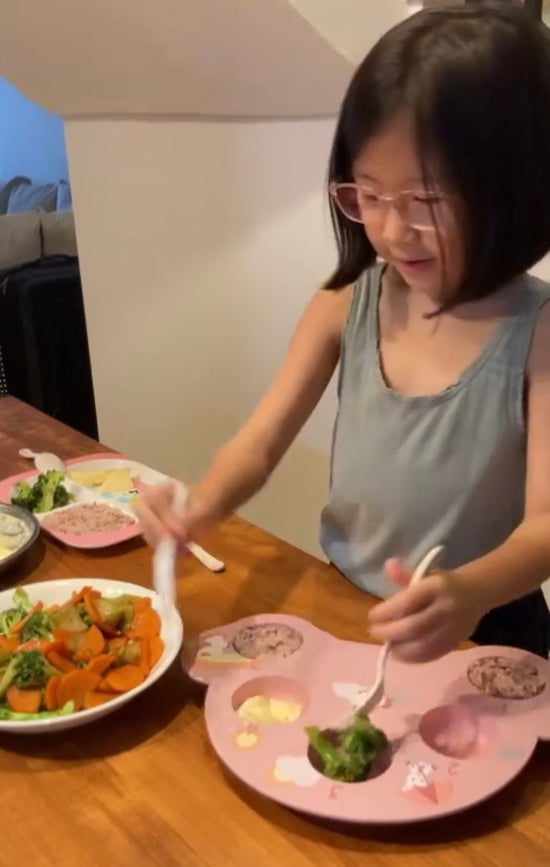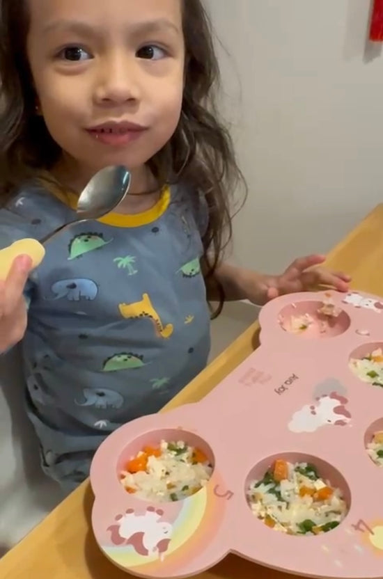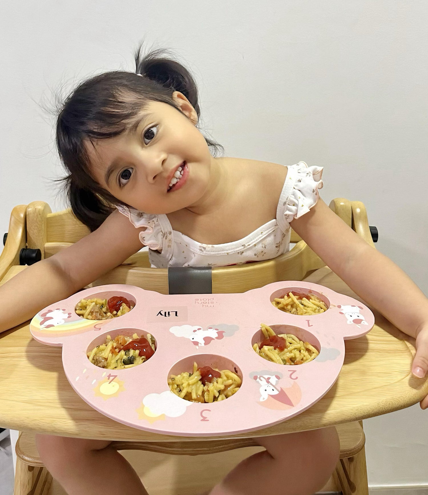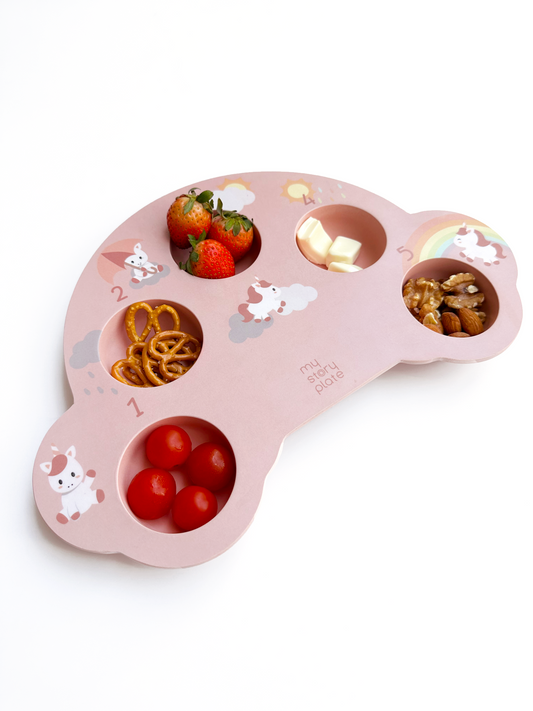 Introducing My Story Plate: a uniquely designed, 5-pod numbered plate that keeps kids focused at mealtime without the need for screens, while encouraging them to eat a wider variety of foods in lesser time.